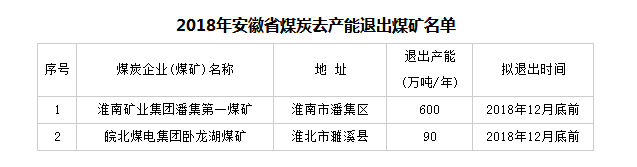 為依法依規(guī)推動(dòng)我省煤炭去產(chǎn)能工作,確保按時(shí)如期完成年度目標(biāo)任務(wù),現(xiàn)將2018年安徽省煤炭去產(chǎn)能退出煤礦名單公示如下: