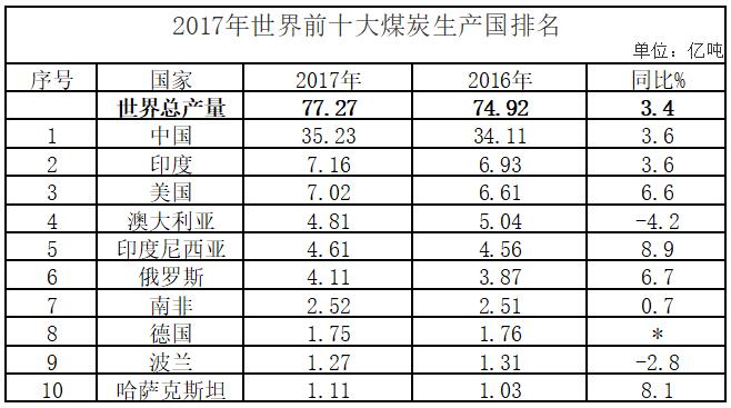據2018《BP世界能源統計年鑒》數據顯示,2017年世界煤炭產量為77.3億噸,比上年上漲3.4%,中國占世界總產量的45.6%,比上年下降0.1個百分點。產量億噸以上的國家有10個,按數量排序為,中國、印度、美國、澳大利亞、印度尼西亞、俄羅斯、南非、德國、波蘭和哈薩克斯坦。前十名國家順位與上年相同,其中澳大利亞、德國和波蘭煤炭產量較上年有所下降,其余國家煤炭產量均有所上漲。