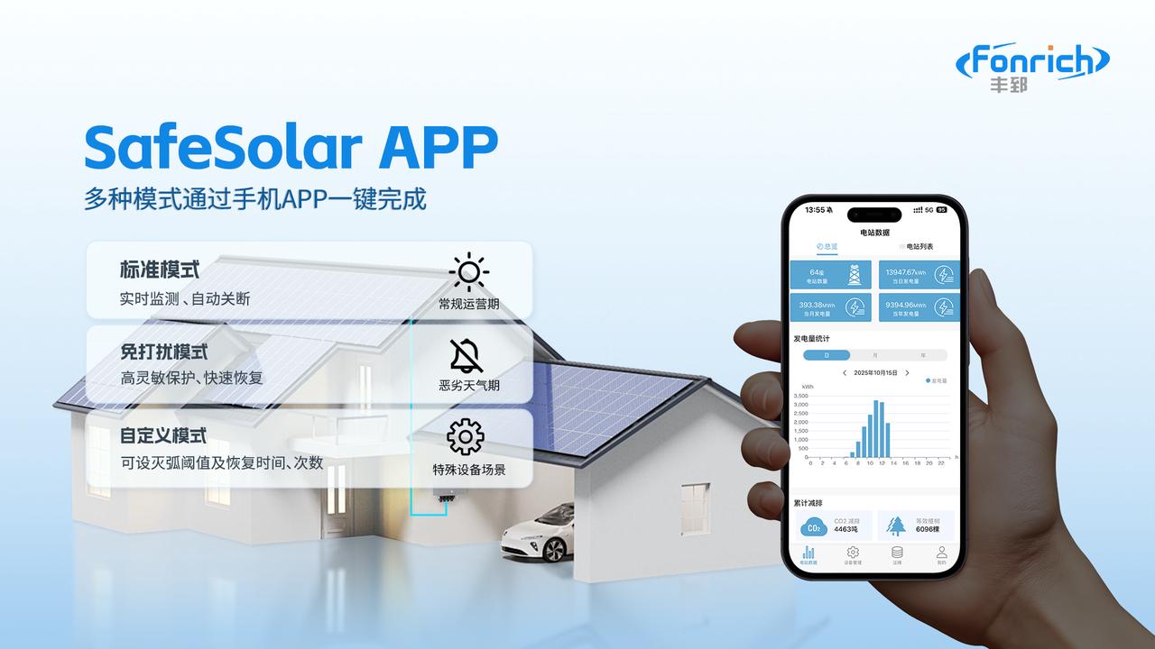 豐郅新能源的屋頂電站電弧保護方案,通過手機APP即可一鍵切換多種模式,為不同工況提供定制化解決方案,帶來三大核心突破:
