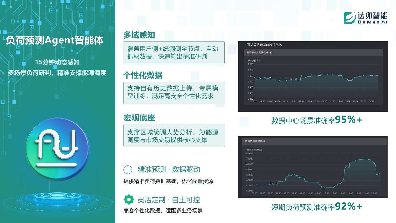 負荷預測Agent :針對數據中心、工業負荷等高精密場景實現動態滾動預測,核心場景預測準確率穩定保持高位,精準捕捉算力波動與用電峰谷變化,為調度交易筑牢數據基礎。