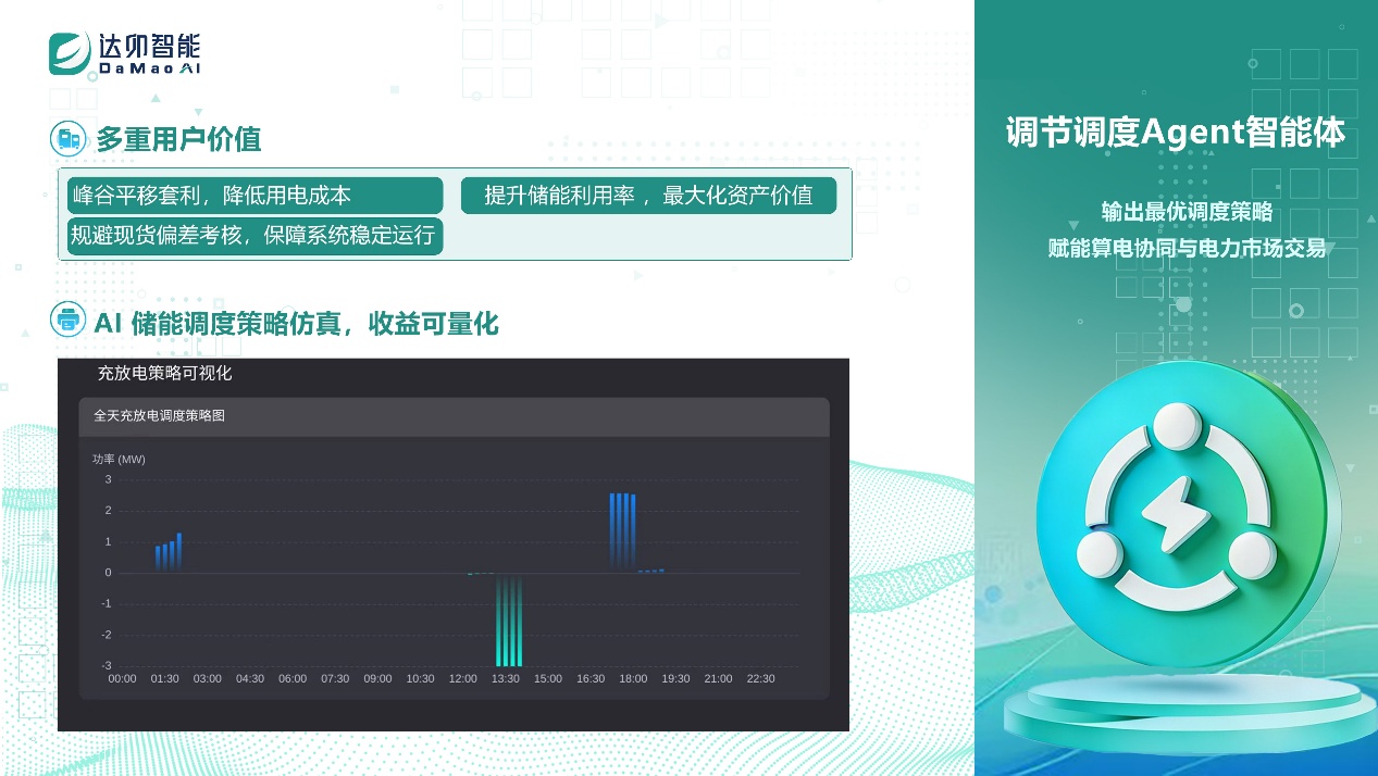 調節調度Agent :承擔算電協同與儲能管理核心職能,自動生成最優充放電策略,實現峰谷套利、負荷平抑,最大化儲能資產價值,并保障負荷運行與電網接入雙穩定。
