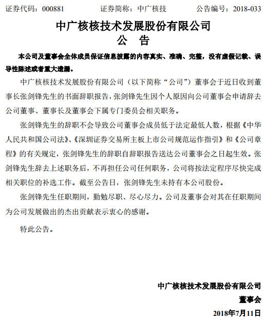 中廣核核技術(shù)發(fā)展股份有限公司發(fā)布公告,張劍鋒因個人原因向公司董事會辭去公司董事、董事長及董事會下屬專門委員會相關職務。截至公告日,張劍鋒未持有本公司股份。