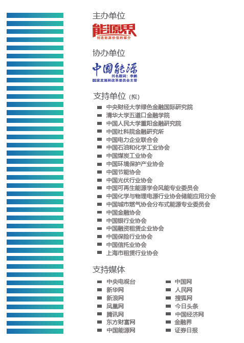 包容、開放、合作是“能金會”一貫主張,各路專家學者、行業大咖共聚一堂,為能源金融發展獻策獻力,實現行業的共享、共贏是大會不變的中心思想。據了解,第二屆“能金會”擬邀請國家級行業協會、重點科研院所、大型咨詢公司、銀行及各分行、融資租賃、保險信托、基金、證券、保理、資本、風投、金控等金融機構和央企及央企子公司、省市級地方國企、水電、儲能、太陽能、風能、氫能、生物質能、新能源汽車、節能、環保、分布式、創新技術、冷熱電聯產、綜合能源服務、能源EPC設計商、承建商等政府機構、科研單位、能源企業和國內權威媒體、行業媒體參會,會議規模預計將達700人。