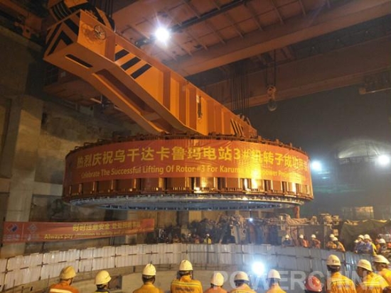 卡魯瑪水電站共設6臺套額定容量為額定功率為100MW(最大功率110MW)的發電機,其發電機轉子包括中心體、支架、磁軛、磁極和制動環,整個轉子組裝在卡魯瑪地下洞室安裝間完成。轉子最大高度1.842米,最大直徑9.350米,包含轉子起吊工具重達350噸,其結構具有足夠的強度和剛度,采用無風扇結構并具有結構合理、緊湊及良好的電磁、通風性能。