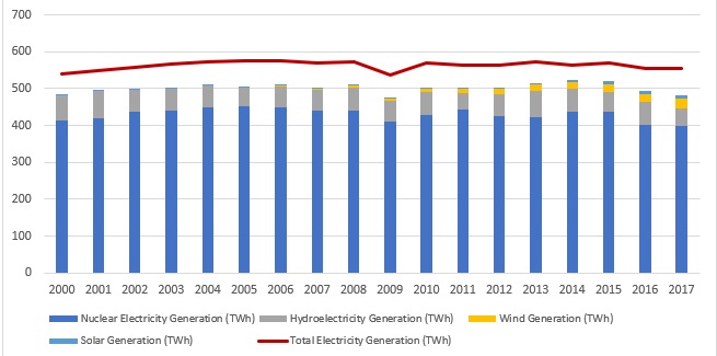 圖1.法國2000 - 2017年的發電量(按太瓦時計算)。