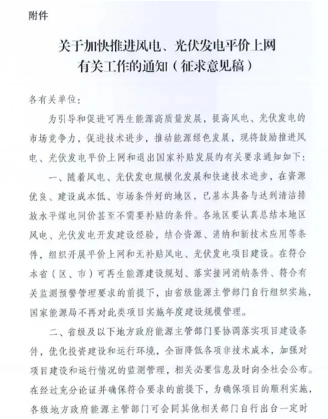據獲悉,近日,國家能源局印發了《關于加快推進風電、光伏發電平價上網有關工作的通知(征求意見稿)》,通知指出,隨著風電、光伏發電規模化發展和快速技術進步,在資源優良、建設成本低、市場條件好的地區,已基本具備與達到清潔排放水平煤電同價甚至不需要補貼的條件。