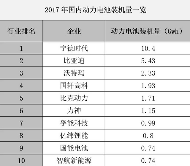 數據顯示,在整個2017年,寧德時代電池裝機量以10.4GWh趕超比亞迪,成為新的行業“一哥”。比亞迪和沃特瑪分別以5.43GWh和2.33GWh排名第二和第三位。在全球范圍內看來,如果算上海外市場的的動力電池出貨量,CATL的累計數據是12GWh,已經超越了排名第二的松下(10GWh),成為了全球范圍內最大的動力電池供貨商。