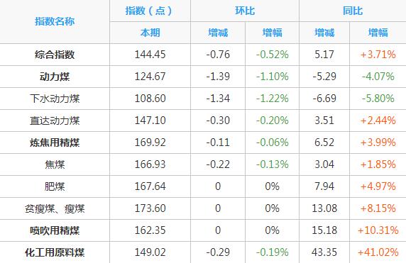 2018年4月9日,第244期中國太原煤炭綜合交易價格指數(shù)為144.45點(diǎn),環(huán)比下跌0.52%。其中:動力煤指數(shù)124.67點(diǎn),環(huán)比下跌1.10%;煉焦用精煤指數(shù)169.92點(diǎn),環(huán)比下跌0.06%;噴吹用精煤指數(shù)162.35點(diǎn),環(huán)比持平;化工用原料煤指數(shù)149.02點(diǎn),環(huán)比下跌0.19%。