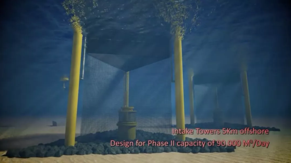 海水首先進入一個裝有水母過濾裝置的取水塔,這個取水塔距離廠房6公里以外的水域,同時還備有石油泄露污染警報浮標。