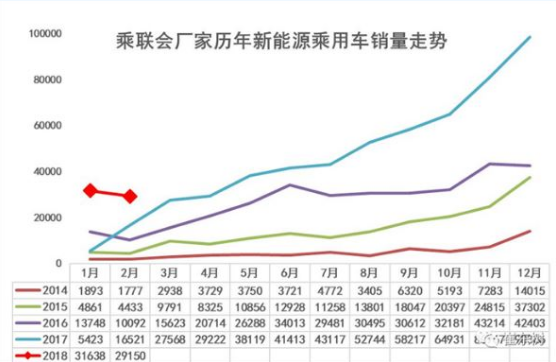 乘聯會2月新能源乘用車銷量出爐。根據乘聯會廠家數據,2月新能源乘用車銷量達到29150臺,同比增長76%,但環比1月銷量下降7%。綜合1月銷量看,新能源汽車產銷在2018年呈現開門紅特征。