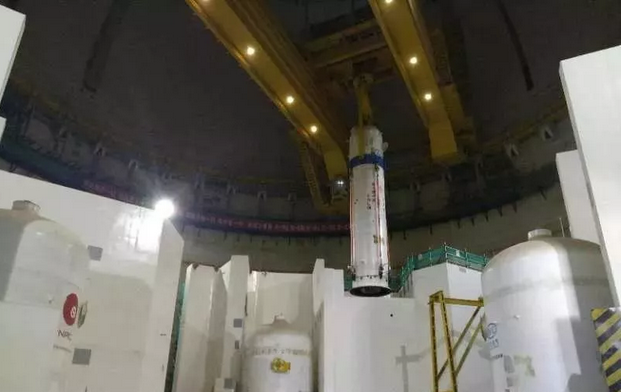 福清5號穩壓器空重約104噸,總高13.8米,要將其引入核島需跨越壓力容器及大半個核島,還要避開前期已就位的蒸汽發生器和主泵等核島主設備,安裝工作難點多且就位要求高。為此核動力院設計人員提前進駐現場,與安裝單位現場分析解決問題,同步修改完善安裝方案,16日歷經吊裝、引入、翻轉等工序后吊入穩壓器隔間,最終于12時26分成功安裝就位。
