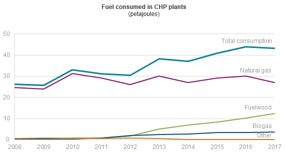 2017年,拉脫維亞熱電聯產電廠主要消耗天然氣(27.1焦耳(PJ))和薪材(12.4 PJ)。在2008年至2017年期間,熱電聯產工廠消耗的天然氣份額從94%下降到接近63%,而RES消耗的份額增長了33個百分點,2017年達到37%。